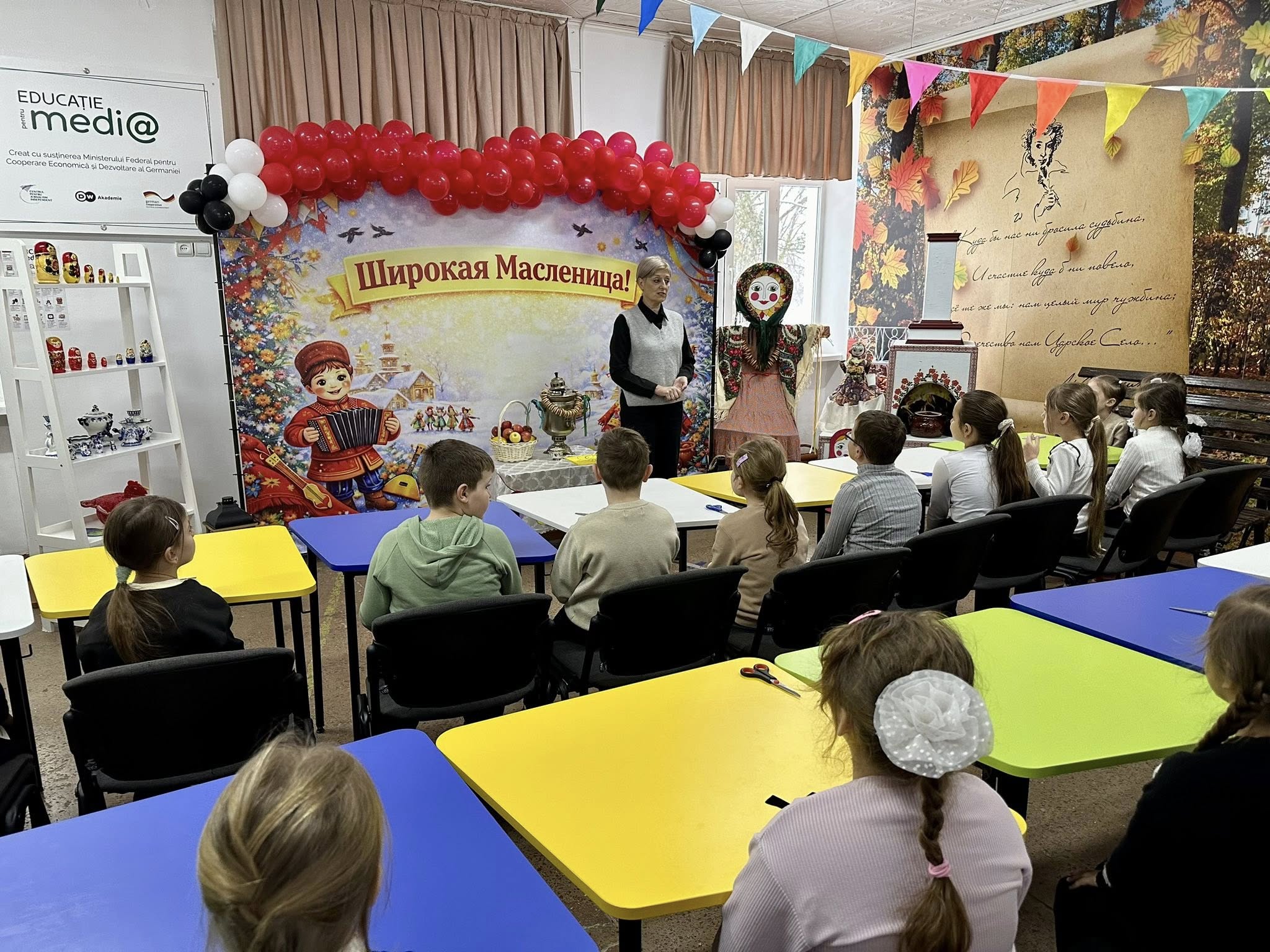 И в то время как в ресурсном центре звучали истории и тёплые слова, члены ученического совета под руководством заместителя директора по воспитательной деятельности Табанской Л. С. наполняли этот день творческой энергией. Сегодня они провели мастер-класс для учащихся начальной школы, помогая ребятам раскрашивать символы Масленицы — солнце, матрёшек и румяные блины. В классах царили вдохновение, яркие краски и радость совместного творчества.