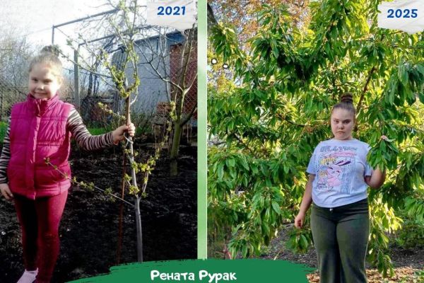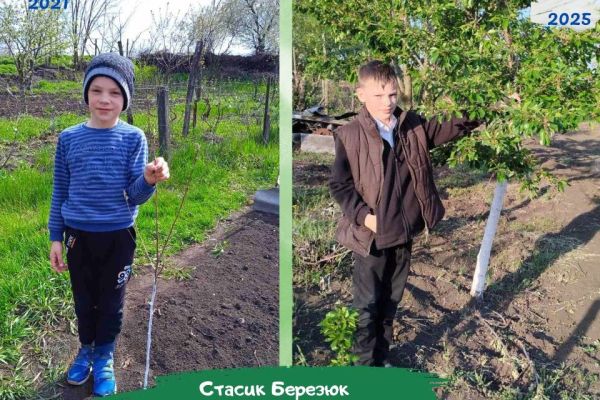 Прошло 4 года. Тогдашние будущие первоклассники усиленно готовятся к национальному тестированию за курс начальной школы. К нашей большой радости, их родители снова откликнулись на нашу просьбу: показали, как живётся деревцам – ровесникам четвероклассников. В нашей фотогалерее вы можете наглядно увидеть, как изменились и те и другие. Говорят, что чужие дети растут быстро… Но эти-то не чужие – свои, родные, а выросли на наших глазах всё равно молниеносно (их родители не дадут соврать!). Выросли во всех смыслах… Что касается саженцев, то опытные садоводы знают, что рост плодовых деревьев изначально запрограммирован на разную скорость развития. Черешня, абрикос, персик растут быстро, они изрядно обогнали в росте своих подросших садовников, груша и вишня только набирают ход, а яблоня не только стремительно взметнулась ввысь, но уже одарила в прошлом году первыми яблочками. Молодец, Серёга! Браво, Максим: прижилось твоё деревце, соревнуется с тобой в росте. (Правда, Ирина, мама Максима, призналась, что первые фрукты были кислыми, но, по понятным причинам, ели их всё равно с удовольствием!)