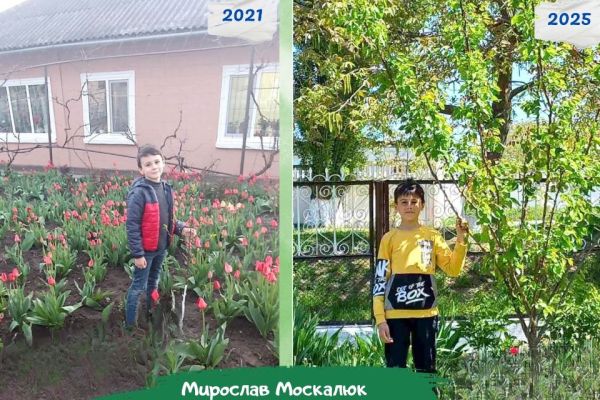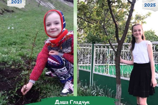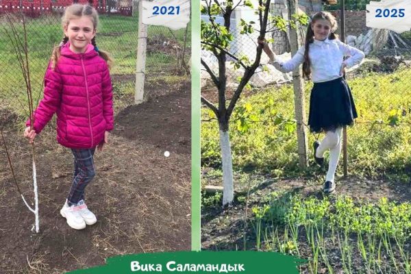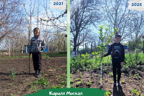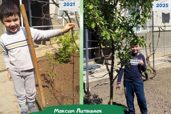 «Будем расти вместе!» - так оптимистично назвали мы свою акцию, которая проходила в рамках экологического двухмесячника непростого «ковидного» 2020-2021 учебного года. Постоянные читатели и друзья лицея, возможно, помнят, в чём была суть задумки. В апреле 2021 года в родительском чате тогдашних дошколят появился призыв: «Посадите дерево вместе с будущим первоклассником! Они будут наперегонки расти вместе, и дерево начнёт наглядно отмерять своим ростом ваши школьные годы». Откликнулись на наш призыв 9 семей. На девяти приусадебных фэлештских участках начали укореняться 9 деревьев. Это были 3 абрикосовых деревца, посаженные вместе с родителями Соней Барбакару, Мирославом Москалюком и Викой Саламандык, 2 черешневых саженца (их посадили вместе с родителями Стасик Березюк и Рената Рурак). Будущий первоклассник Кирилл Москал посадил саженец груши, Даша Гладчук – персик, братья Рома и Саша Никифоровы – вишню, а Максим Литвинюк – яблоню, которую по-братски окрестил Серёгой.