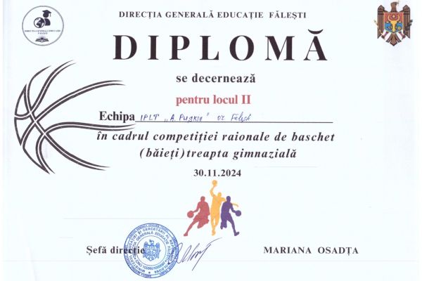 🏆 Не подвели лицей и юные спортсмены из гимназической команды баскетболистов под руководством Владимира Александровича Волошина: на районном чемпионате, проходившем 30 ноября – 1 декабря в рамках Спартакиады школьников, они заняли второе место, уступив только команде хозяев турнира из лицея «М. Эминеску». Вот имена победителей, достойно представивших наш лицей: Бузовой Олег, Ифоди Александр, Крецу Глеб, Лучко Максим, Петричук Вадим, Робу Артём, Руснак Артур, Фуйор Дмитрий, Чуйко Иван.