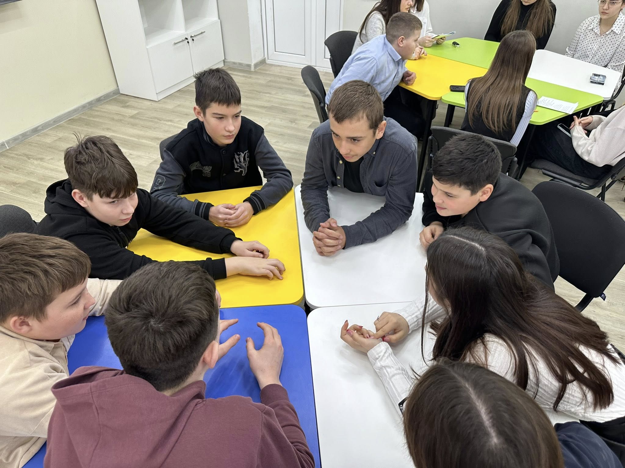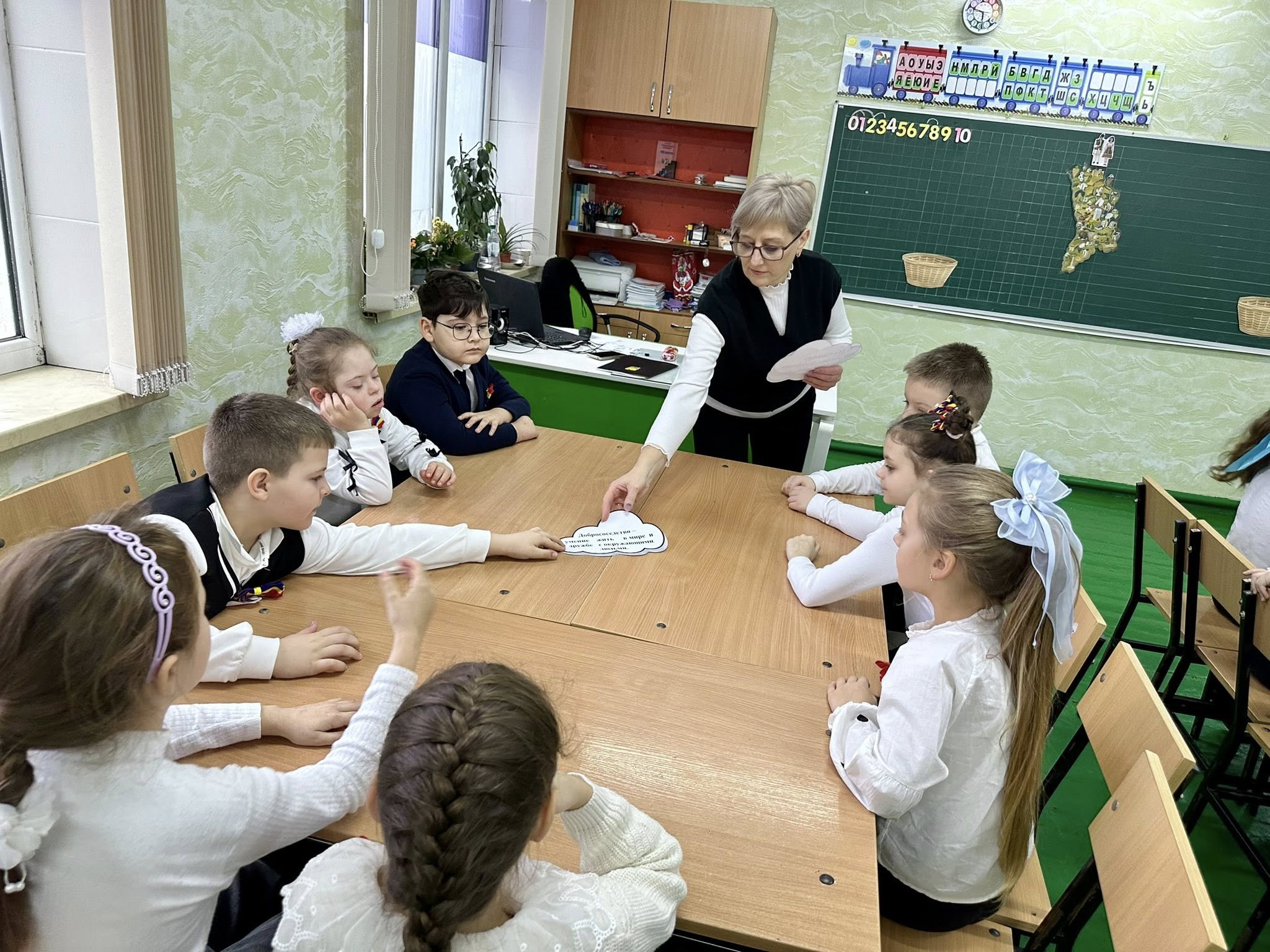Особую эмоцию подарил момент деления на группы. По задумке учителя Ева осталась без команды, но лишь на мгновение. Класс словно стал единым сердцем — дети дружно звали девочку к себе, доказывая без слов, что в мире дружбы нет «чужих» и «лишних». Так добрососедство обрело голос и улыбку.