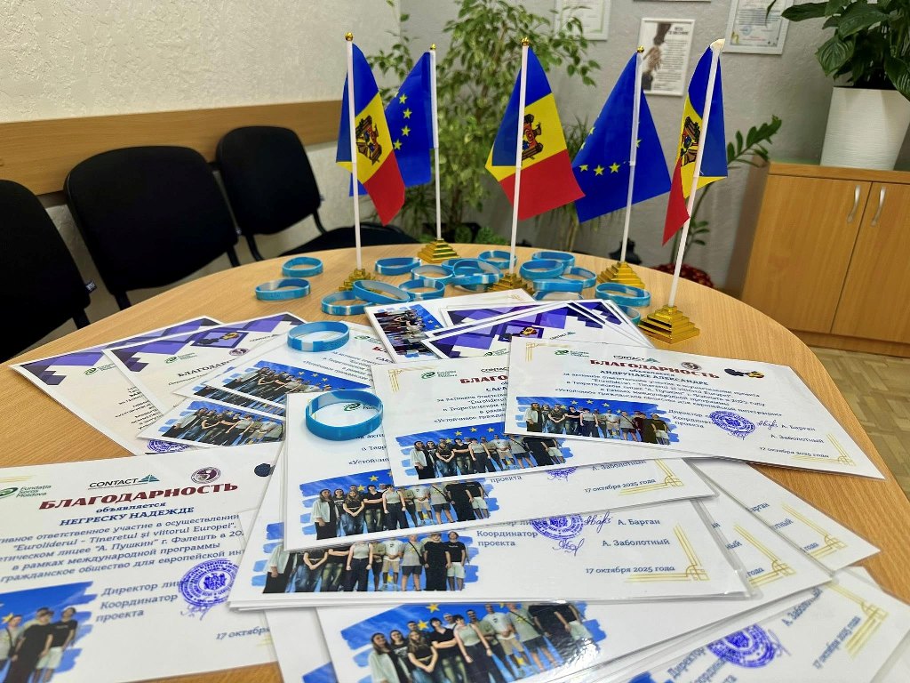 Пятничное утро встретило лицей пасмурным небом, но никакая мгла не смогла затмить праздничного предвкушения. Ведь сегодня завершался не просто рабочий день — подходил к финалу уникальный проект EuroLiderul – „Tineret și viitorul Europei”, который на протяжении двух месяцев вдохновлял, объединял и формировал европейское сознание молодёжи. Проект, рождённый по инициативе преподавателя гражданского воспитания Александры Анатольевны Барган и реализованный при финансовой поддержке Centrul Contact, стал настоящей школой лидерства, партнерства и мечты о мирном едином будущем.