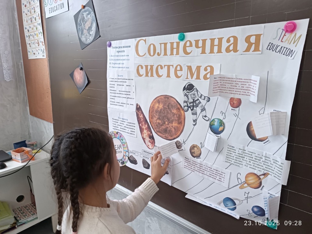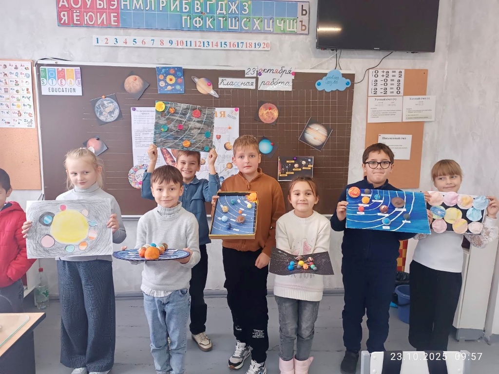 Кульминацией проекта стал день космического путешествия — интерактивный урок «Экскурсия по Солнечной системе». Маленькие исследователи с гордостью представляли результаты своей работы, рассказывали о планетах, отгадывали загадки и делились открытиями. Атмосфера в классе напоминала настоящий полёт — захватывающий, добрый, полный восторга и света.