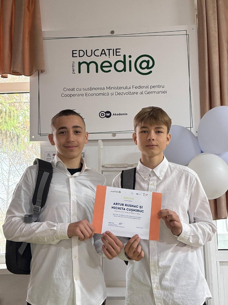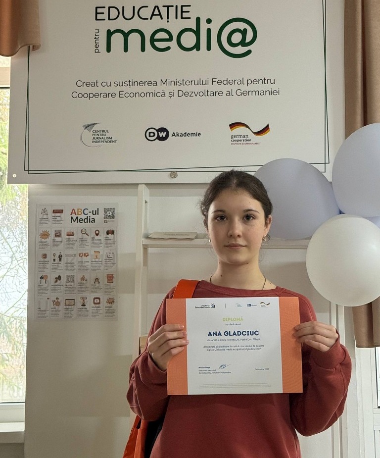 Совсем недавно мы уже делились радостной новостью о победе наших учеников — Аны Гладчук, Артура Руснака и Никиты Кушнирюка — в республиканском конкурсе цифровых постеров „Educația media ne ajută să #gândimcritic”, организованном Centrul pentru Jurnalism Independent Moldova при поддержке DW Akademie Europe and Central Asia.